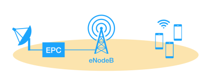 With an Internet connection, a computer to run the EPC, and a base station, we can set up a small LTE network anywhere! The EPC is the network core that manages everything from network subscribers, packet forwarding, to mobility management [3]. At the ICTD lab, we wrote a lot of the code to operate the EPC. In the figure below, you can see that the EPC is connected to the rest of the Internet via a connection on the left side. The connection links this small town to the rest of the world, and could be a satellite, wireless link, or fiber-optic cable. To the right of the EPC is the base station (eNodeB). The base station sends out the LTE radio signal, and mobile phones in the network connect to it.