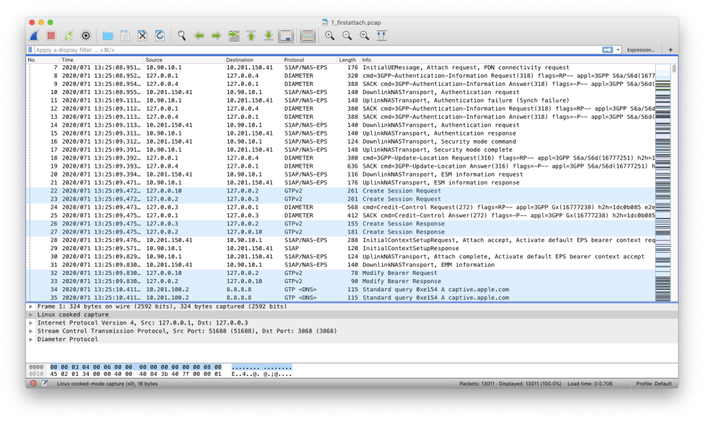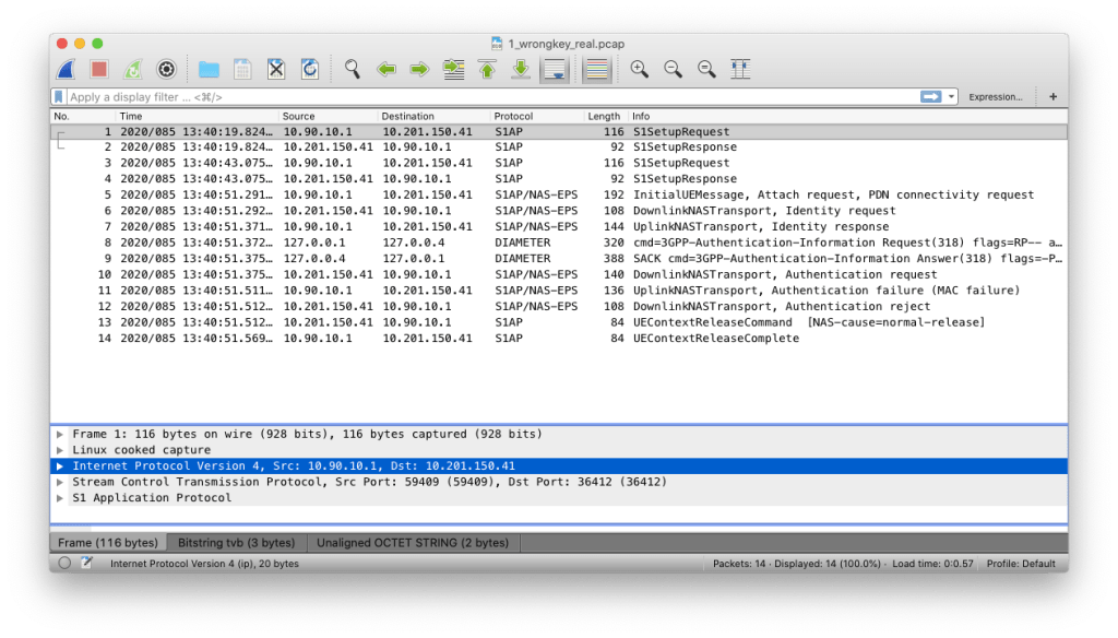 PCAP 2: This PCAP shows a successful initial attach. Note that Packet 11 shows a “Sync Failure” but this is normal, and you will see this the very first time a new SIM connects to the network. This is because on first attach, the network does not have any valid SQN for the SIM, so they use a “Sync Failure” to establish the first working SQN. If you’re curious as to why this is the case, or just want to learn more about LTE security and SQNs in general, I recommend Nick’s article on USIM Authentication as well as Sudheesh’s article on LTE Authentication.
