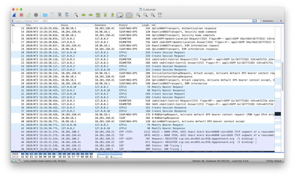 PCAP 4: In this PCAP, the phone is configured for VoLTE (powered by the IMS system) as well as Internet data traffic. IMS requires that the phone establish a separate PDN connection (with APN name “ims”) to the EPC. You can see this happen as soon as the default PDN is established – note the “PDN Connectivity Request” in Packet 28, followed by all the PDN establishment signaling through Packet 42. For clarity, we assigned the handset has a different IP address for each PDN, so that we can easily tell the difference between traffic on the default “internet” PDN (10.201.100.2) and traffic on the “ims” PDN (10.201.100.3). Finally, the phone uses the “ims” PDN to send a SIP REGISTER request to the address of the P-CSCF, which was provided to it during the PDN establishment handshake (specifically, Packet 38).