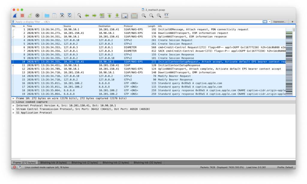 PCAP 3: If a phone detaches and reattaches to the network, it can reuse the existing security handshake. Hence, this call-flow is shorter and lacks some of the messages of the above call-flow. Running a production network, you will probably see this call flow much more frequently than any other ones.